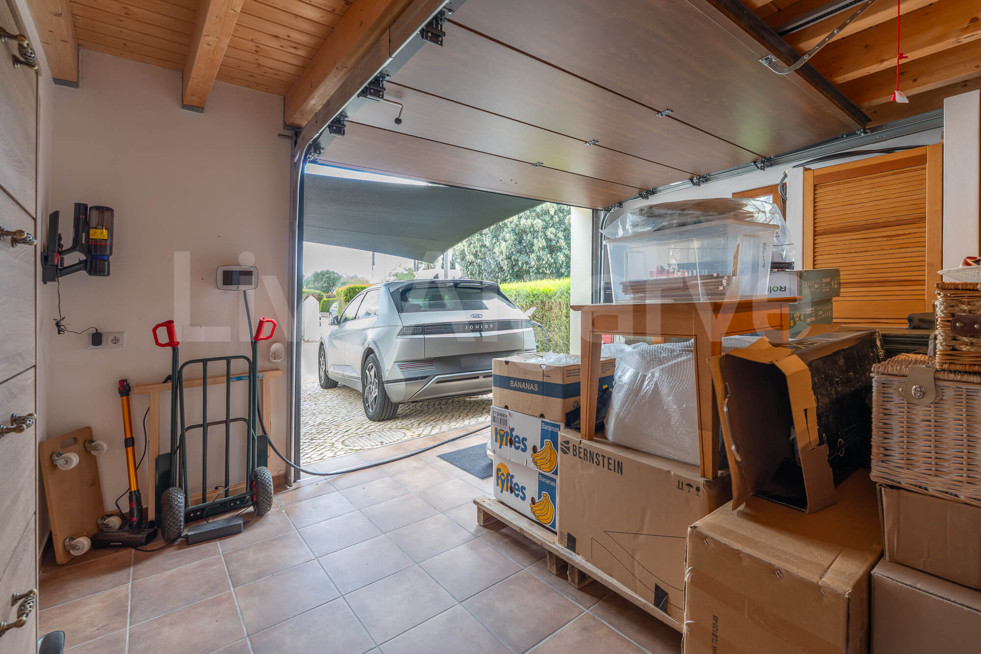 Die große Garage bietet Einbauschränke, einen Waschbereich sowie eine Vorinstallation für das Aufladen von Elektrofahrzeugen. Ein Dachboden erstreckt sich über die gesamte Garage und bietet zusätzlichen Stauraum.