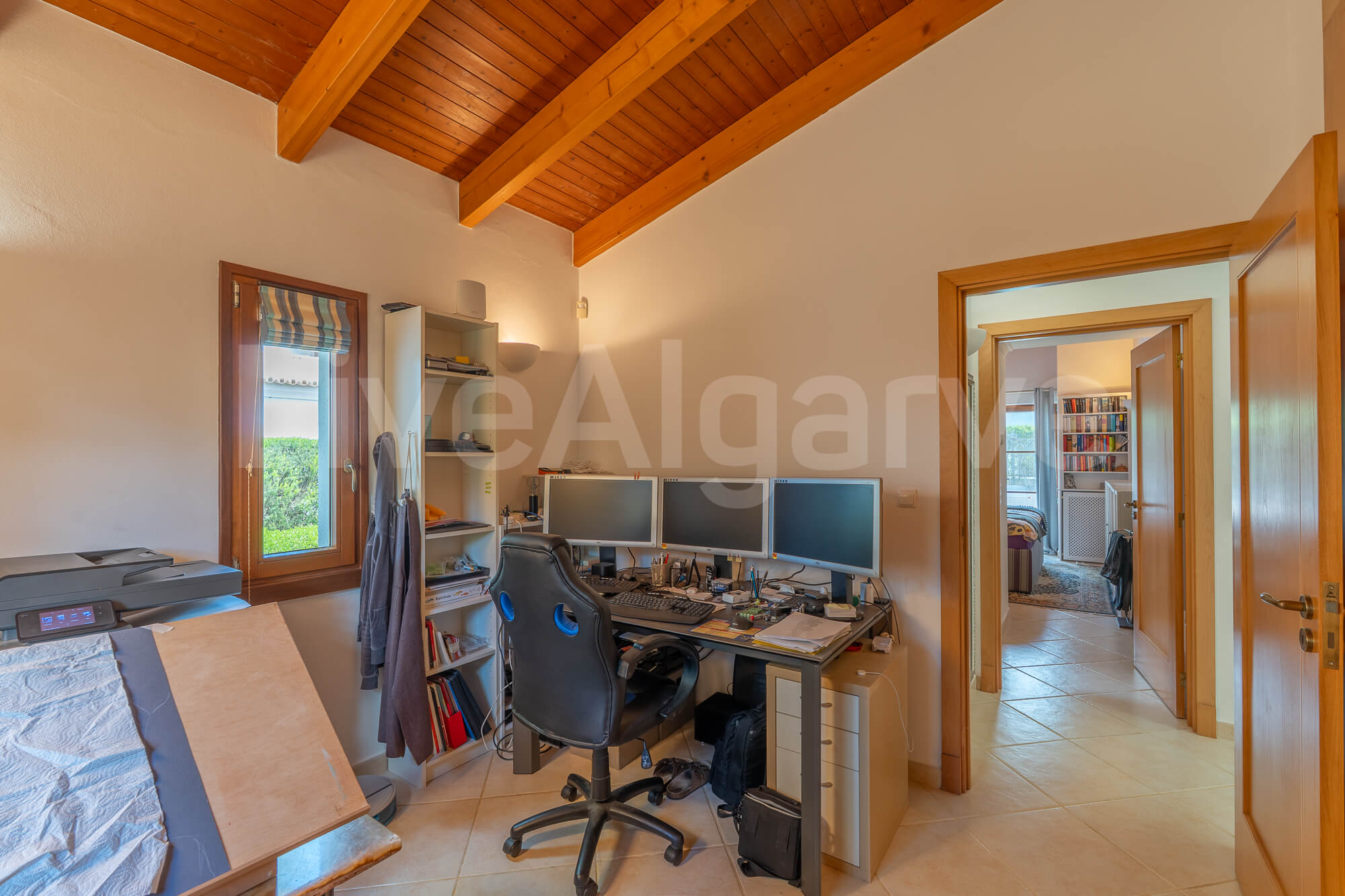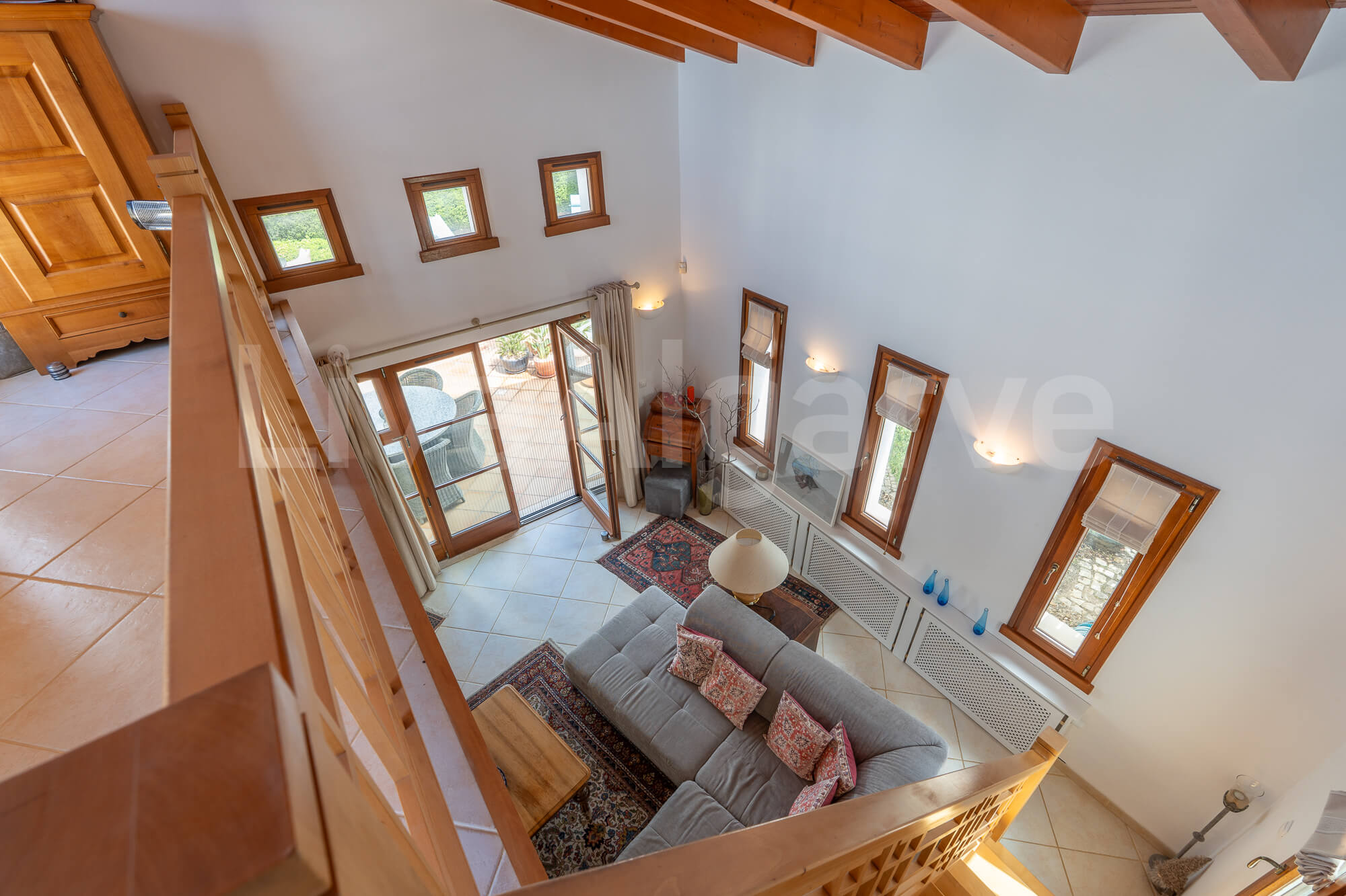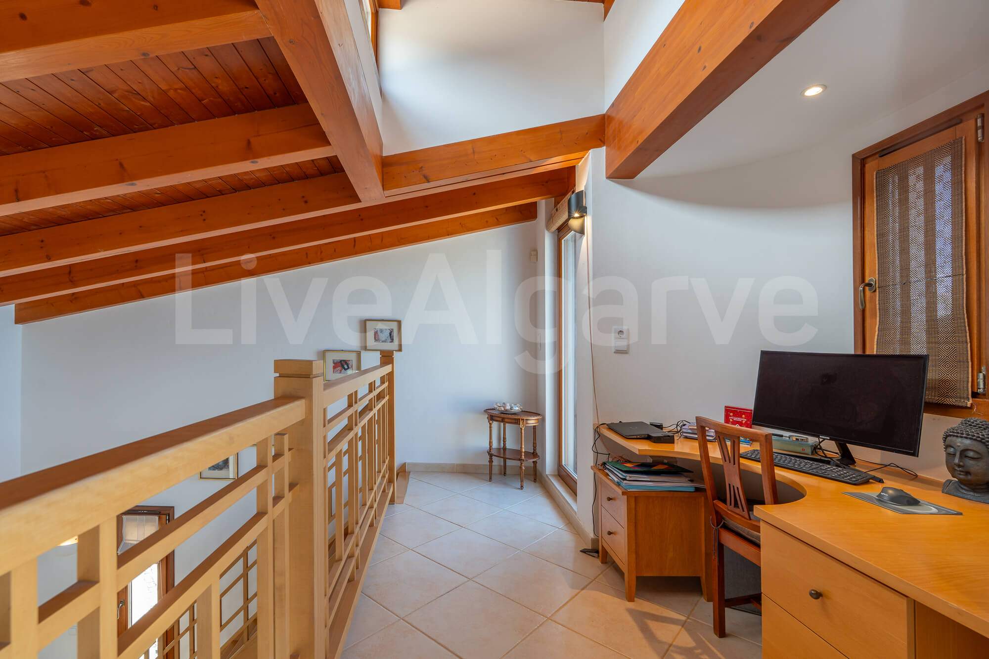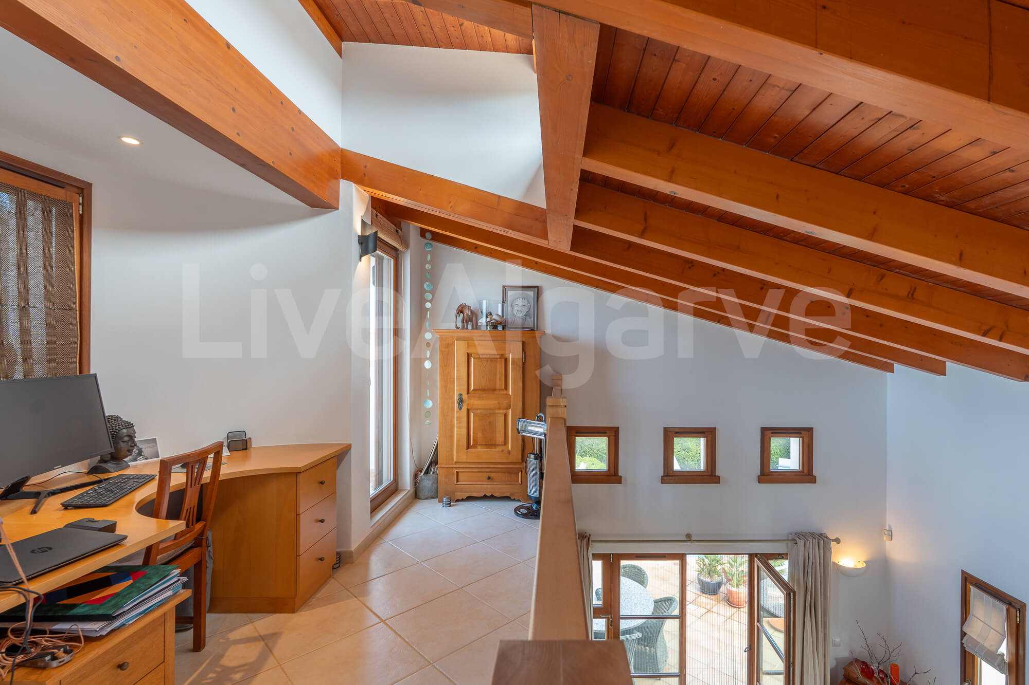 Ein Holz-Mezzanin, das über eine schön gestaltete Treppe erreichbar ist, dient als erhöhter Arbeitsbereich. Diese Anordnung sorgt für Abgrenzung und bewahrt zugleich die Verbindung zu den Hauptwohnbereichen, was ideal für die Arbeit im Homeoffice ist. Die Mezzanin bietet direkten Zugang zu einer Terrasse, wodurch der nutzbare Raum erweitert wird und das Klima der Algarve optimal genutzt werden kann.