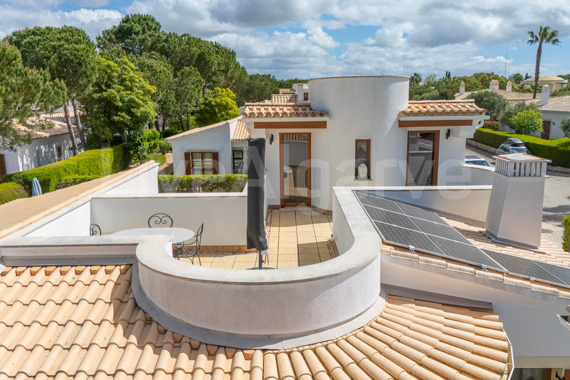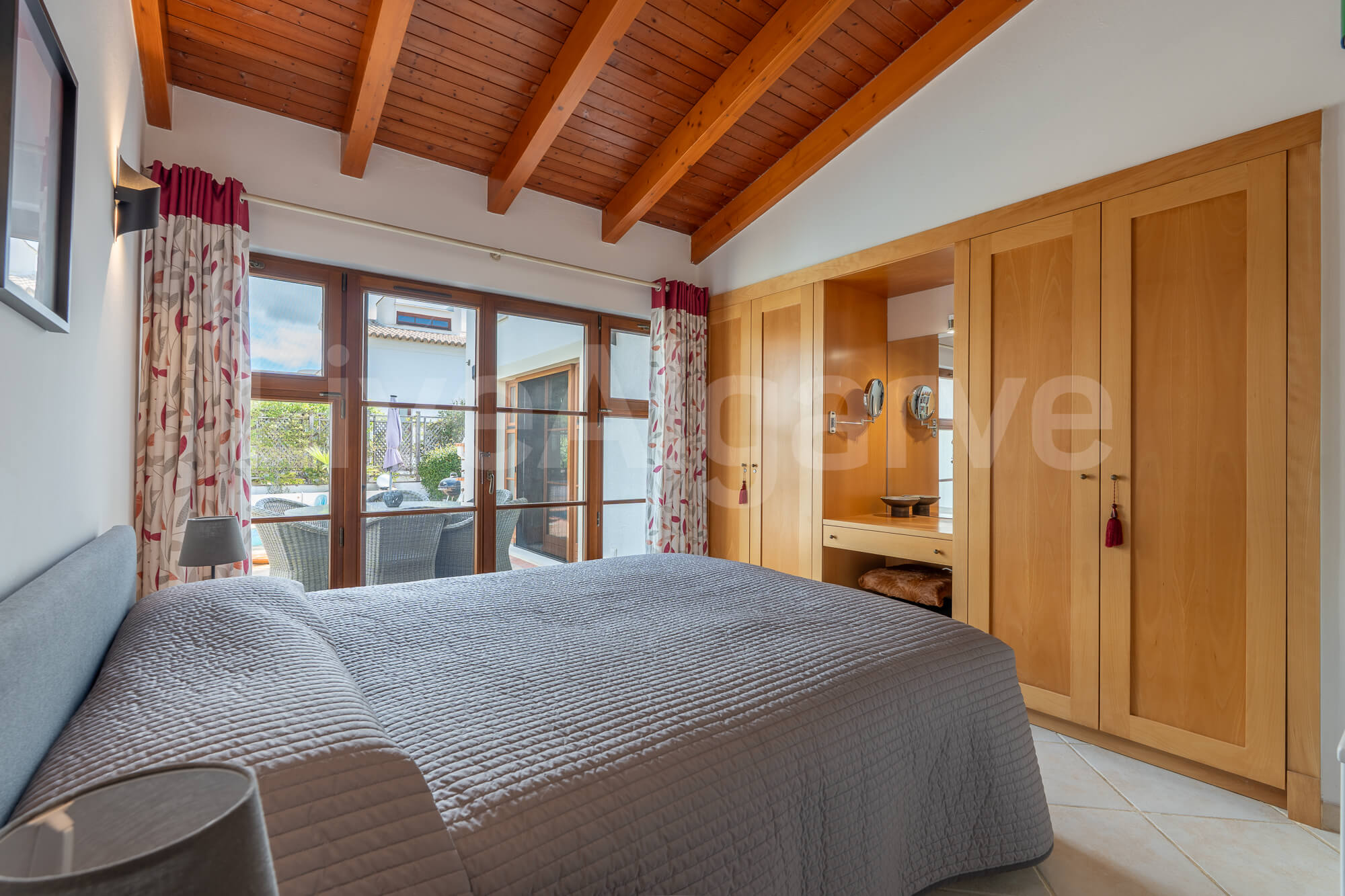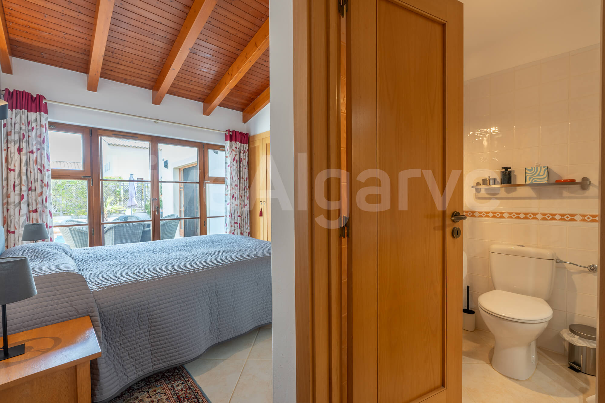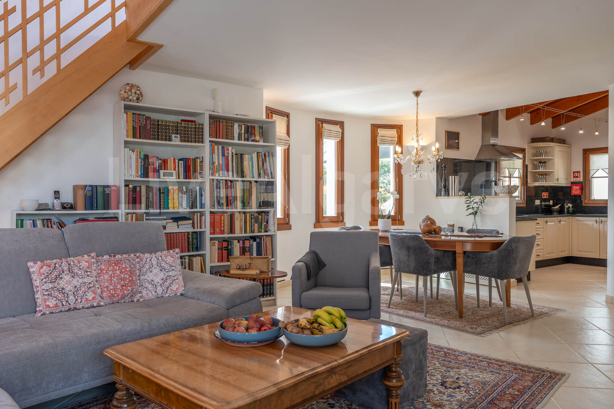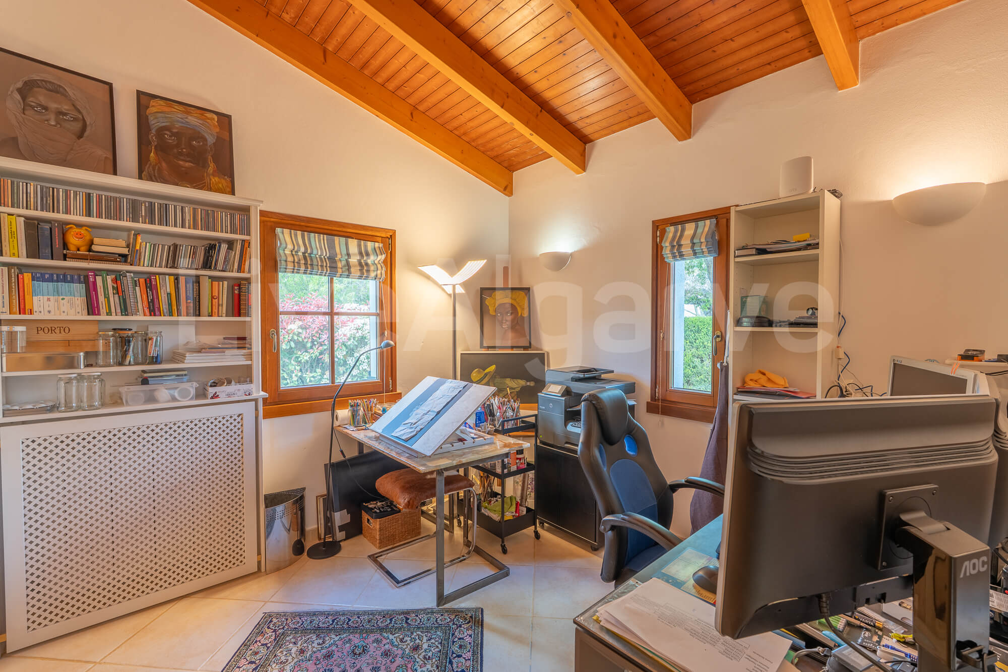 Ein Holz-Mezzanin, das über eine schön gestaltete Treppe erreichbar ist, dient als erhöhter Arbeitsbereich. Diese Anordnung sorgt für Abgrenzung und bewahrt zugleich die Verbindung zu den Hauptwohnbereichen, was ideal für die Arbeit im Homeoffice ist. Die Mezzanin bietet direkten Zugang zu einer Terrasse, wodurch der nutzbare Raum erweitert wird und das Klima der Algarve optimal genutzt werden kann.