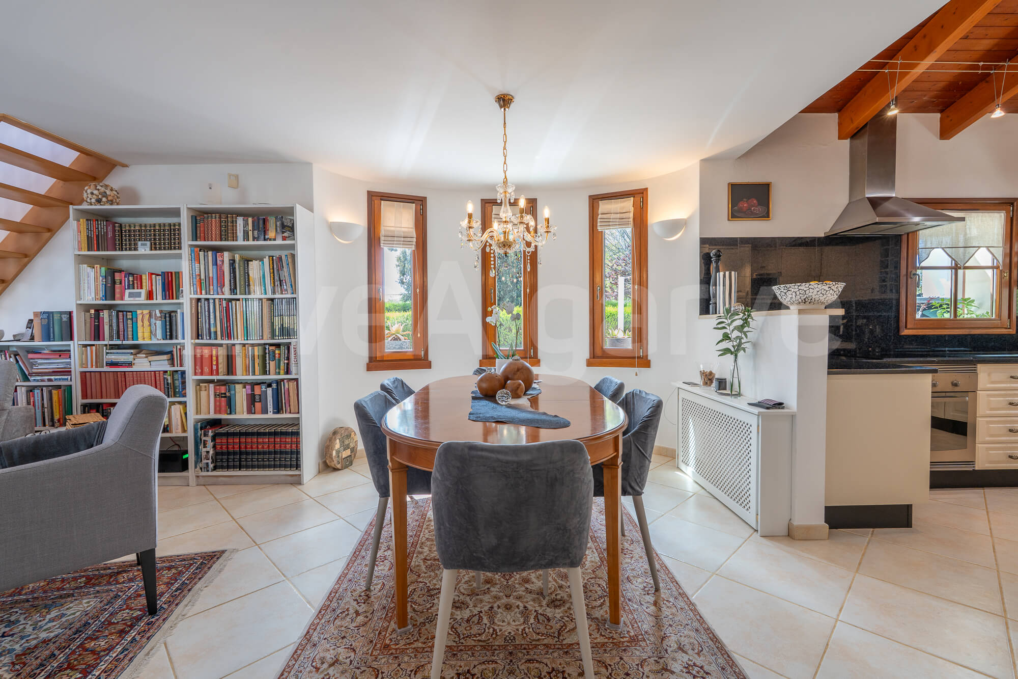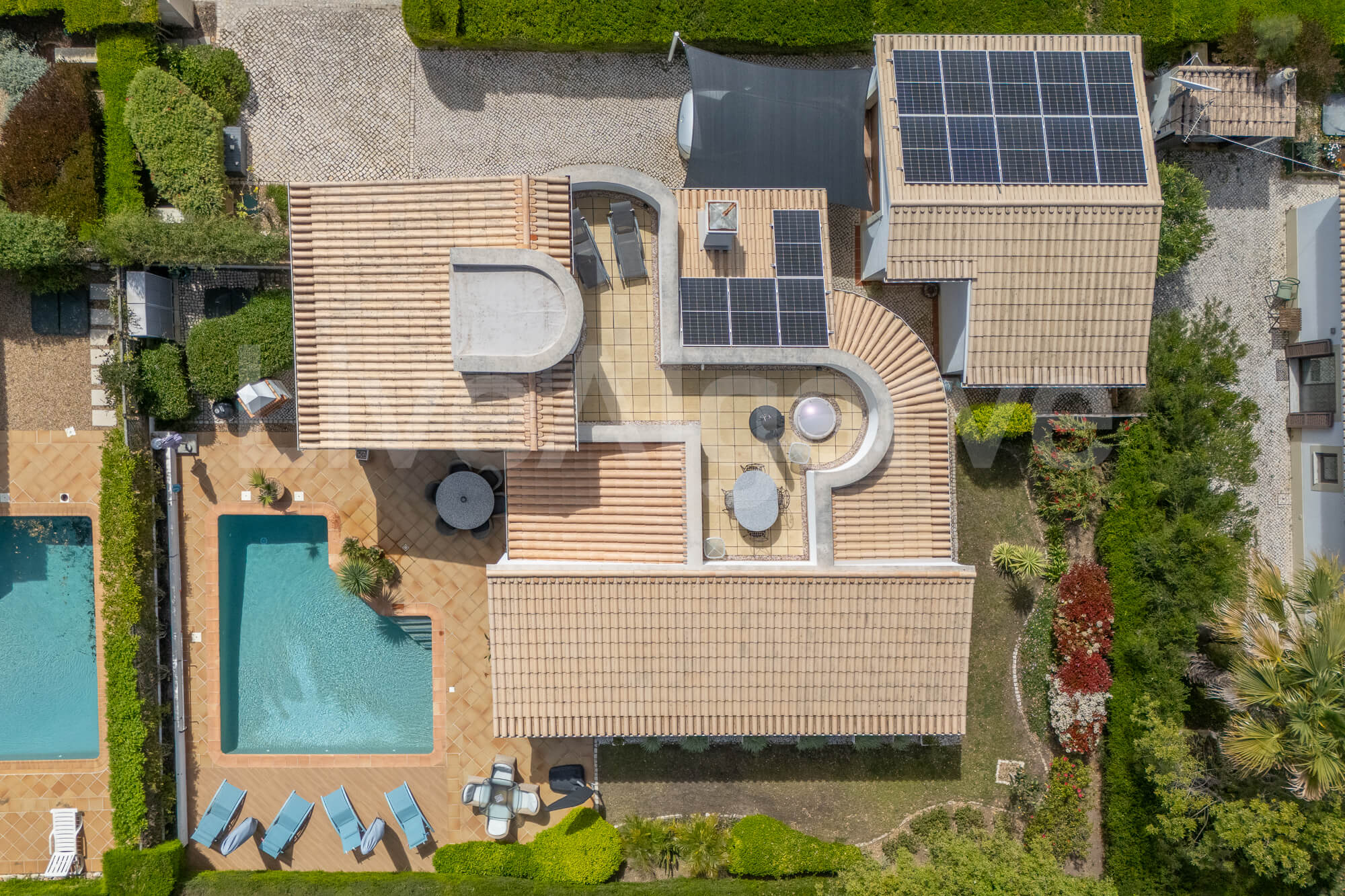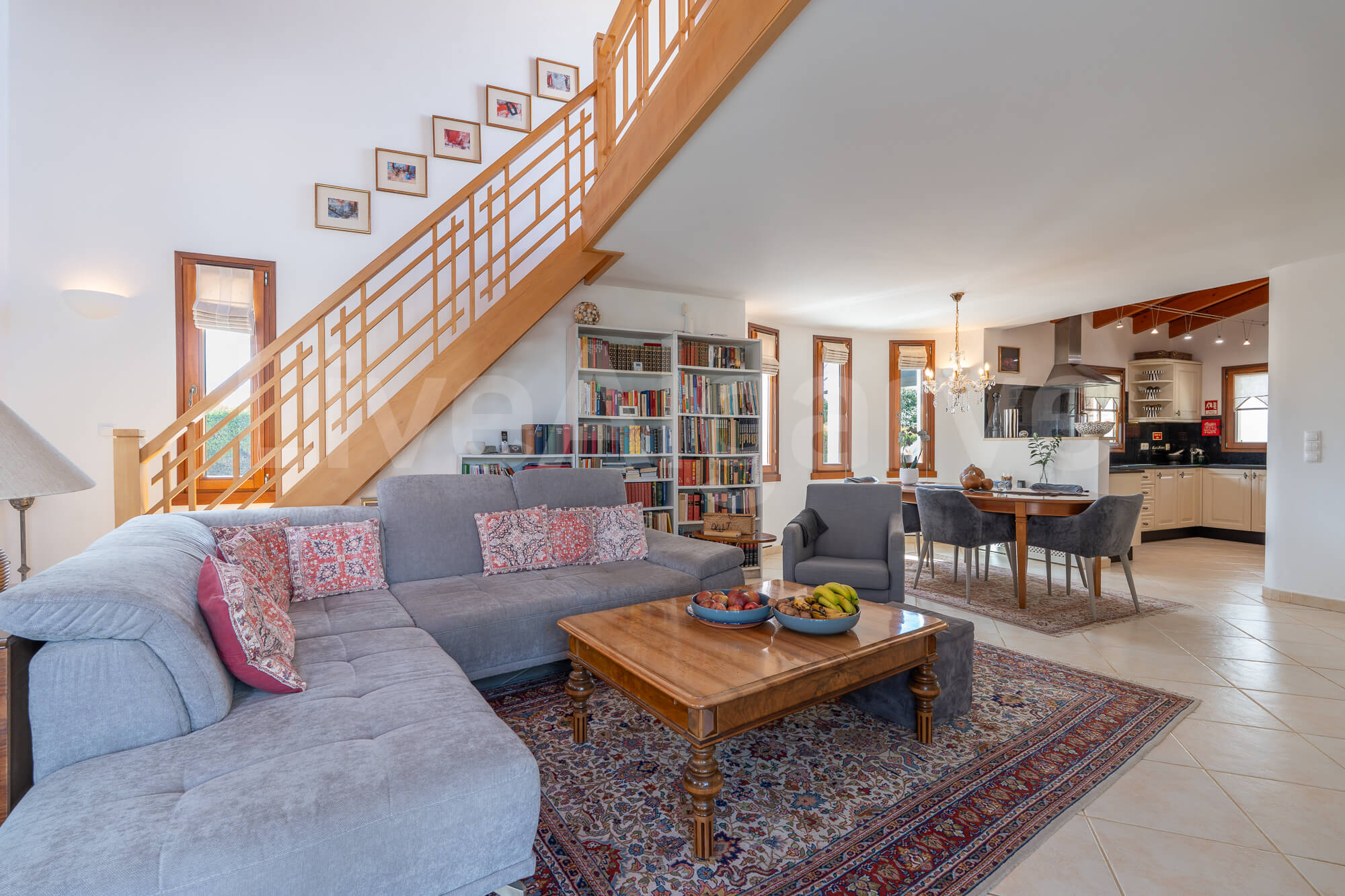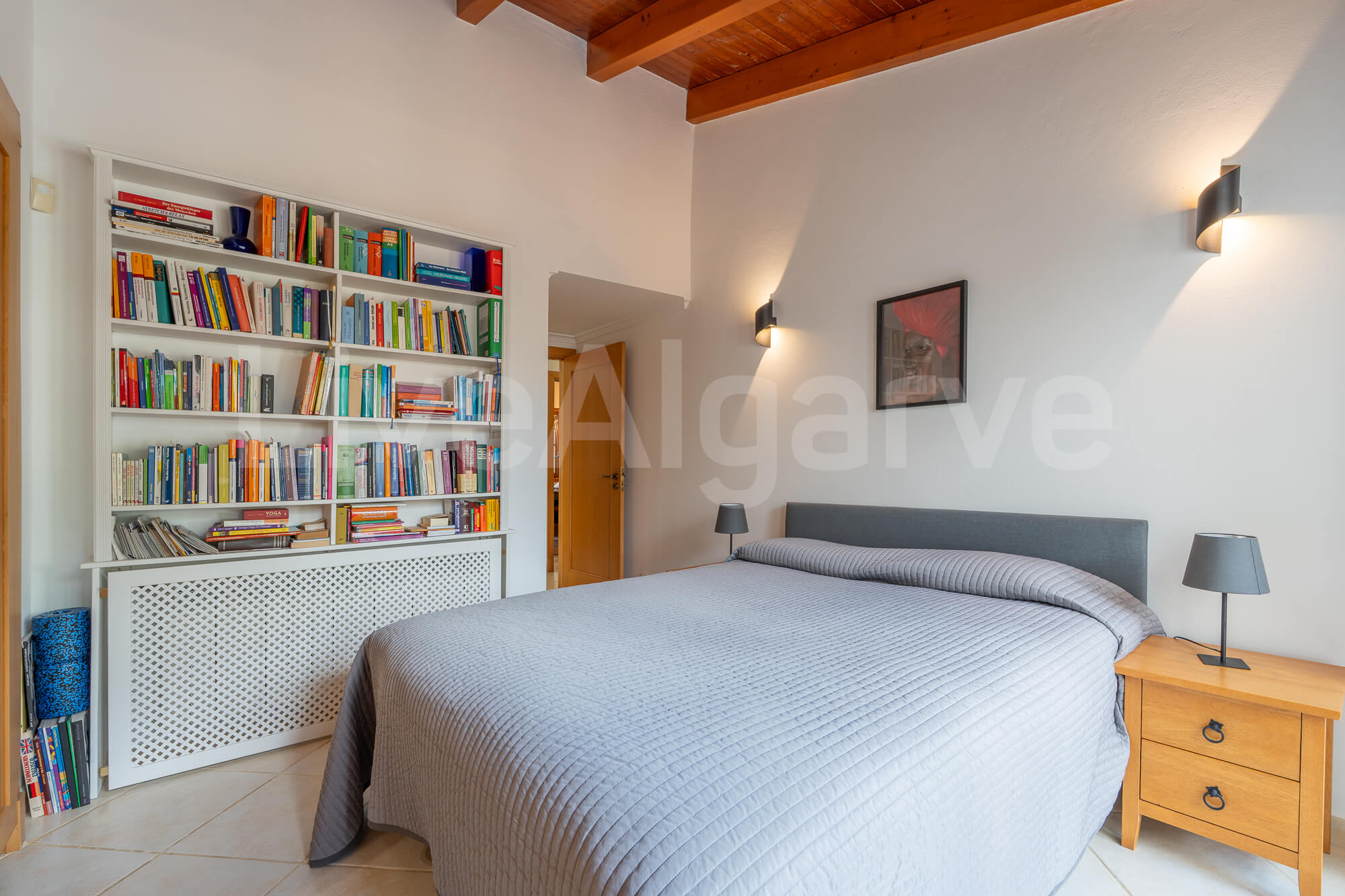 Ein Holz-Mezzanin, das über eine schön gestaltete Treppe erreichbar ist, dient als erhöhter Arbeitsbereich. Diese Anordnung sorgt für Abgrenzung und bewahrt zugleich die Verbindung zu den Hauptwohnbereichen, was ideal für die Arbeit im Homeoffice ist. Die Mezzanin bietet direkten Zugang zu einer Terrasse, wodurch der nutzbare Raum erweitert wird und das Klima der Algarve optimal genutzt werden kann.