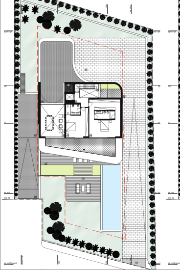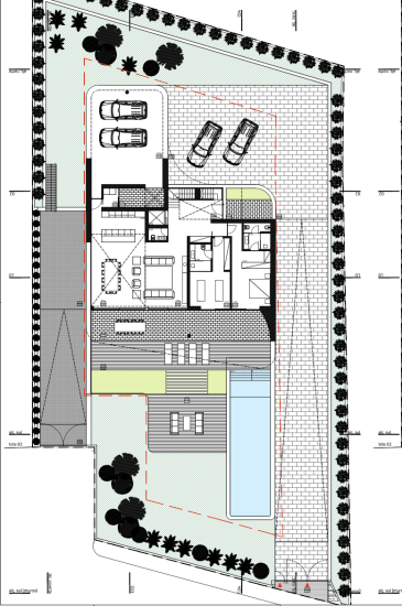 Des revêtements de sol de haute qualité, un aménagement paysager structuré et des murs de délimitation discrets reflètent une approche réfléchie et holistique de la conception extérieure. La voie d'accès met en valeur à la fois l'espace et l'accessibilité.