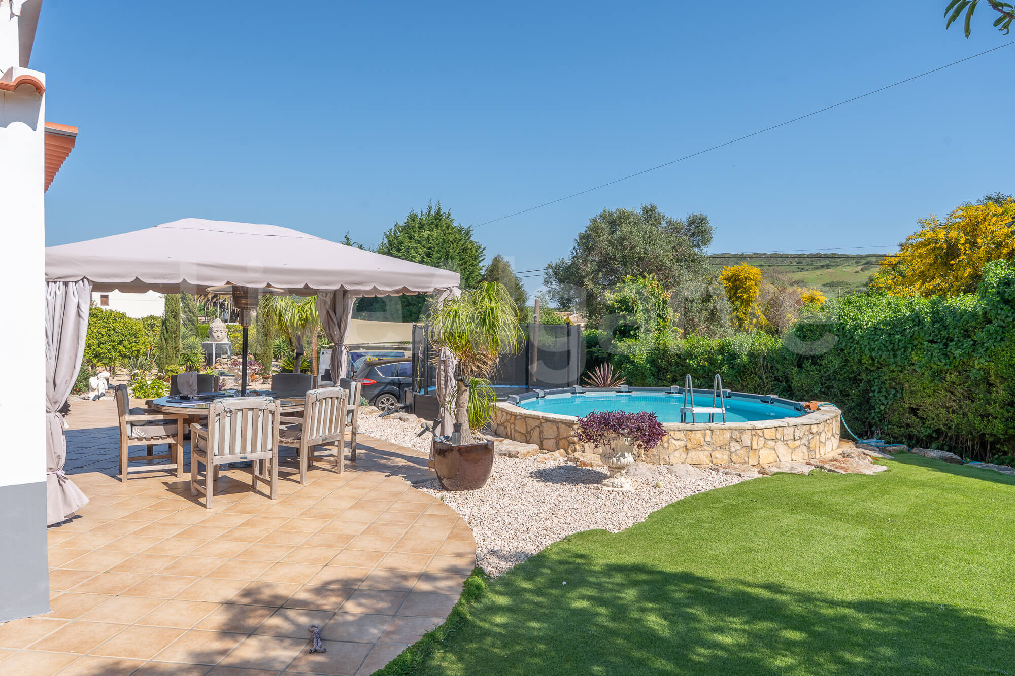 Heating is provided through underfloor systems, while cooling is supplied via ducted systems, both of which respond to seasonal needs. The double garage contains a workbench, mezzanine storage, and the technical room, where all energy systems converge. The swimming pool is complemented by a heated overflow jacuzzi, surrounded by Portuguese stonework. Gardens, designed and maintained by specialists, create year-round variety in colour and form.